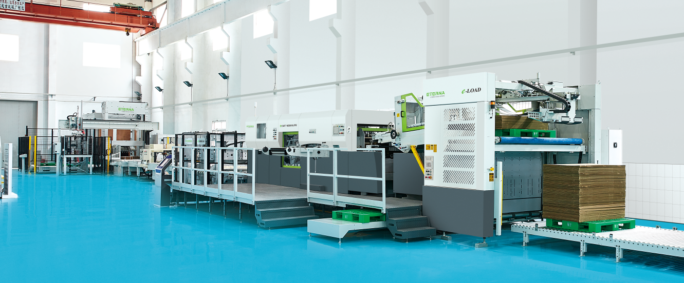 Based on the Group technology and Shanghai Eternal manufacturing advantages, the automatic e-LINE with high quality and reasonable price has been launched according to the actual needs of the domestic packaging industry. It includes e-LOAD, automatic flatbed die cutting machine ECUT 1650, e-BREAK, e-PAL, turning table, and transfer table, etc.